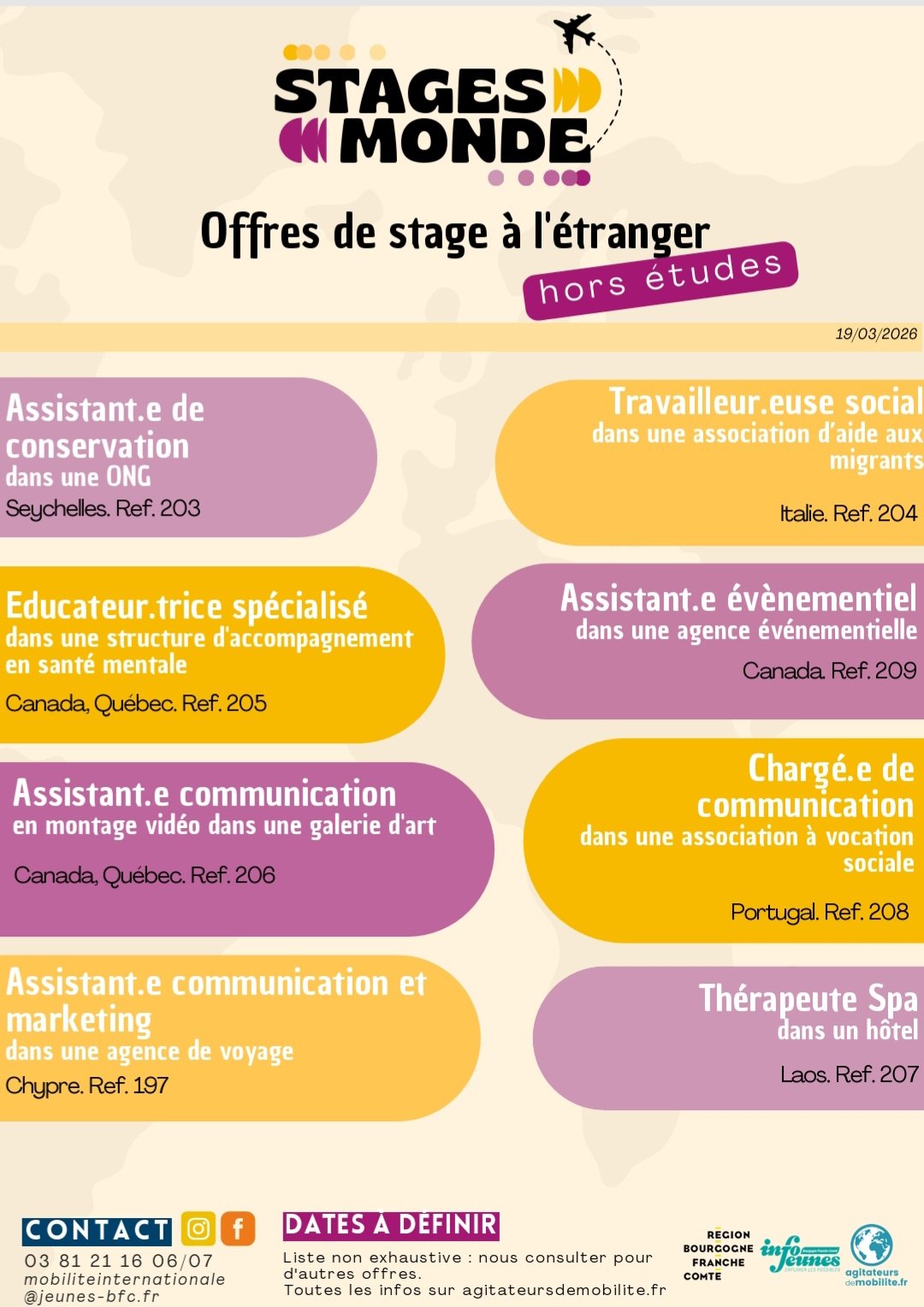 offres de stage hors cursus à pourvoir à l'étranger , notamment dans les métiers du domaine social et de la communication/marketing, pour diffusion à vos étudiants et anciens étudiants.